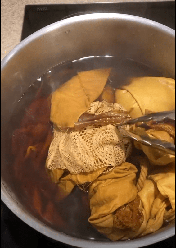 - Add the dye source to a pot and fill in enough water to cover the dye source and dye material.