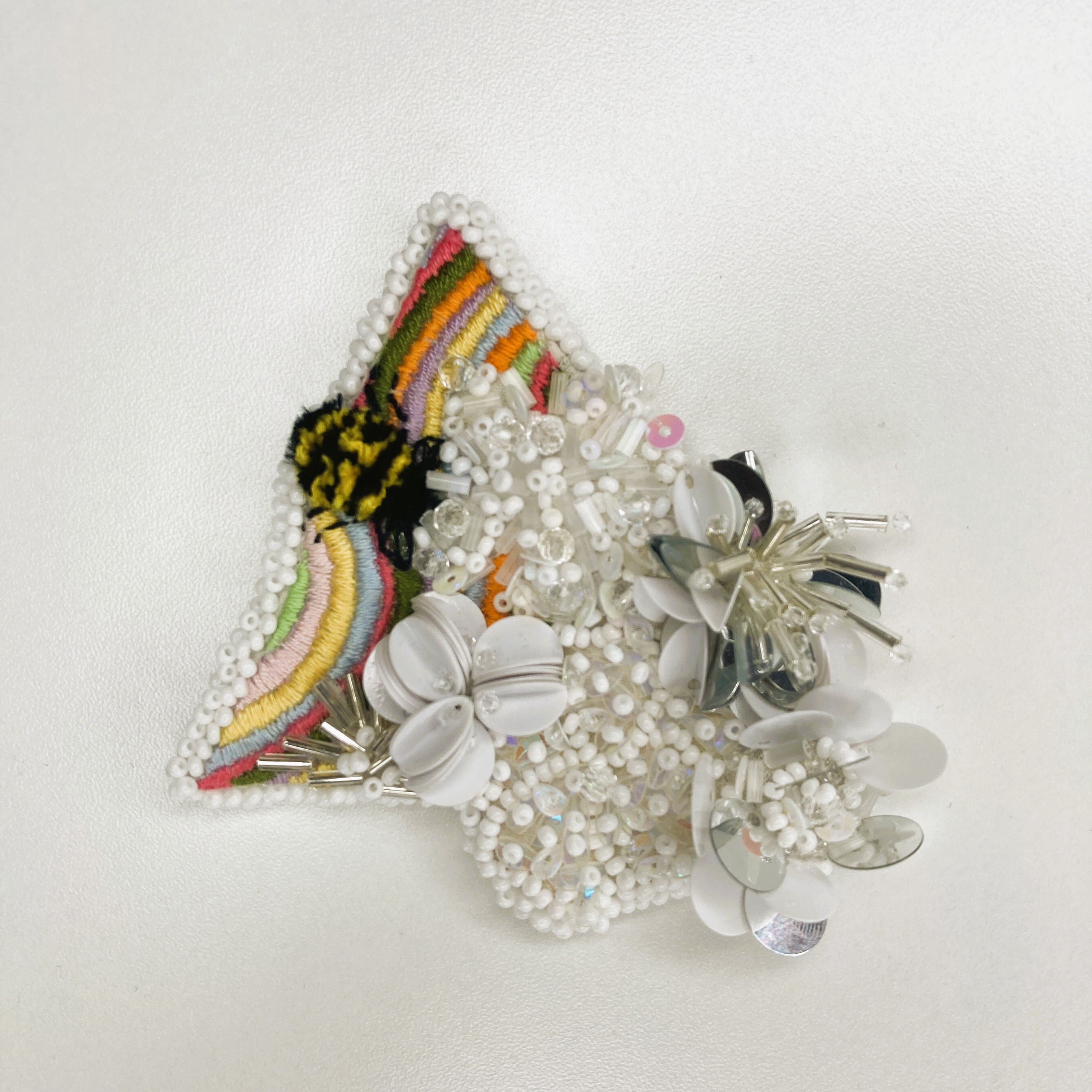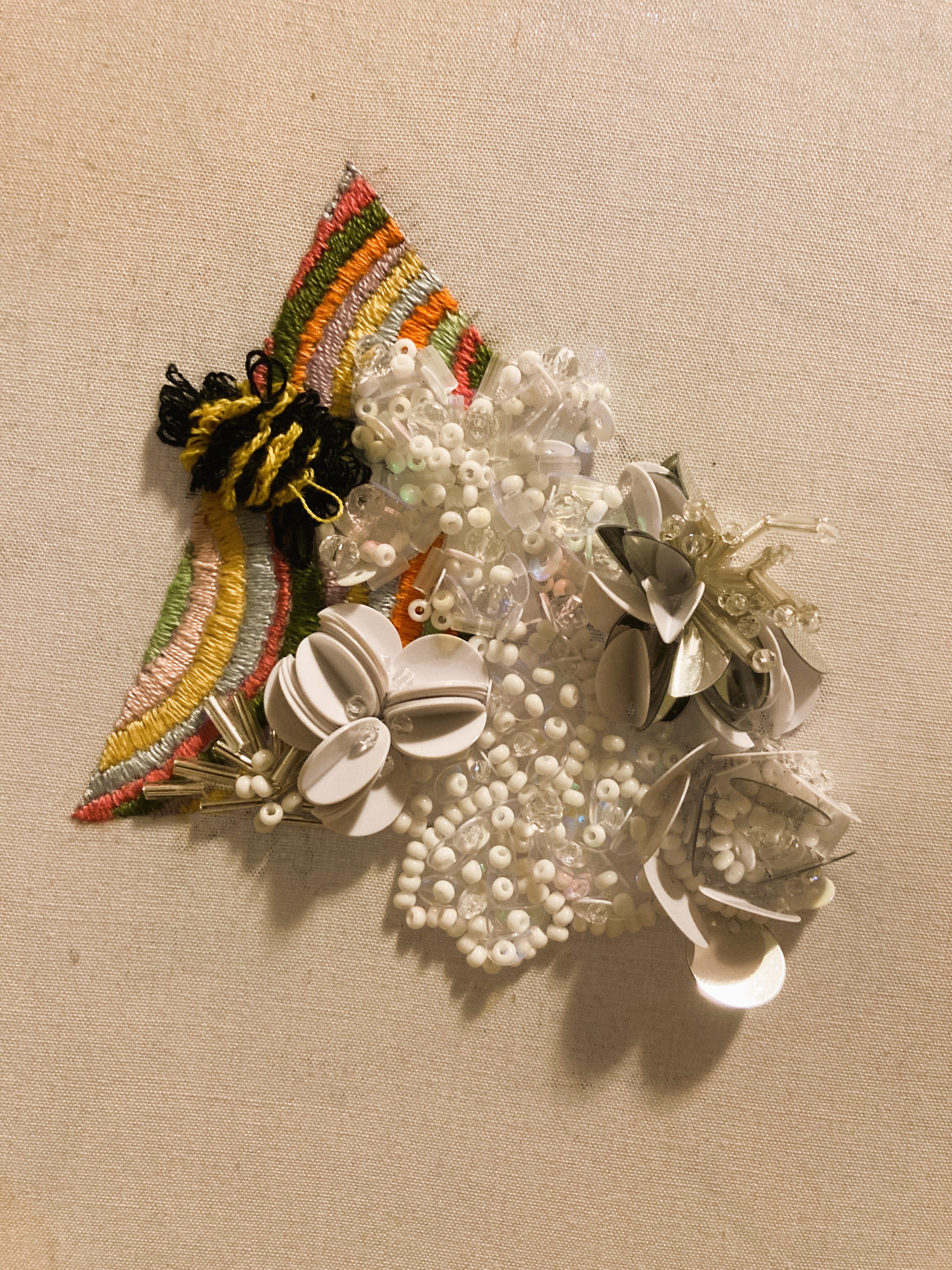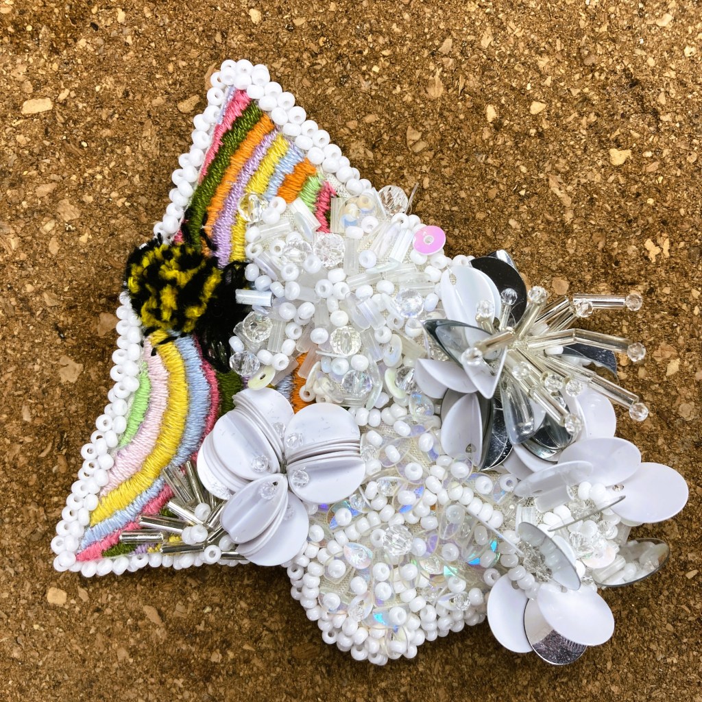 Get to know me through my work. The entire patch is meticulously embroidered on linen fabric and supported by a felt backing. Vibrant lines and the bee feature stitching with one-ply polyester/cotton blend thread. The three-dimensional flowers are crafted using white Japanese beads, clear glass beads, plastic tube beads, flat sequins, and paillette sequins, all secured with clear monofilament thread.