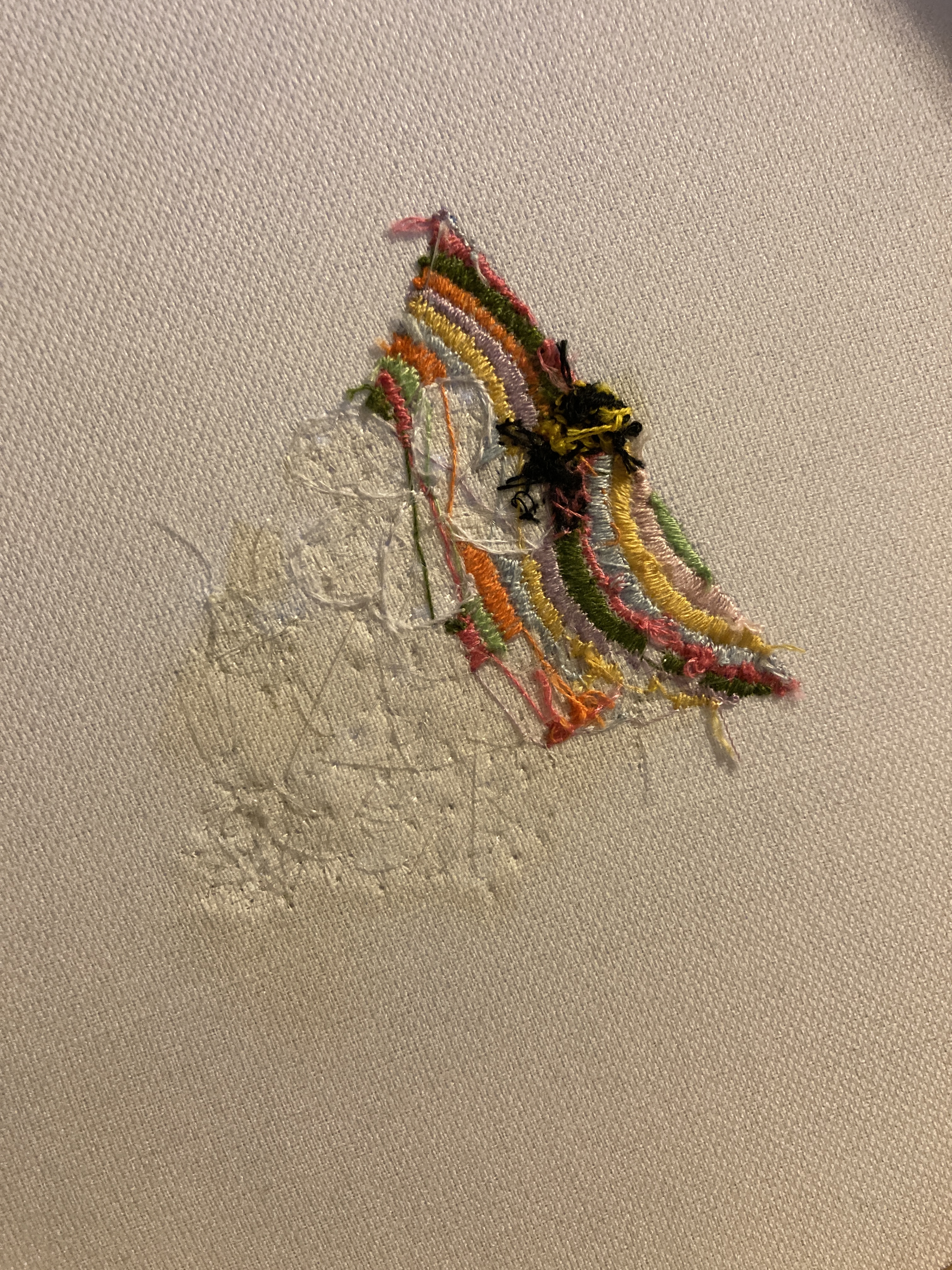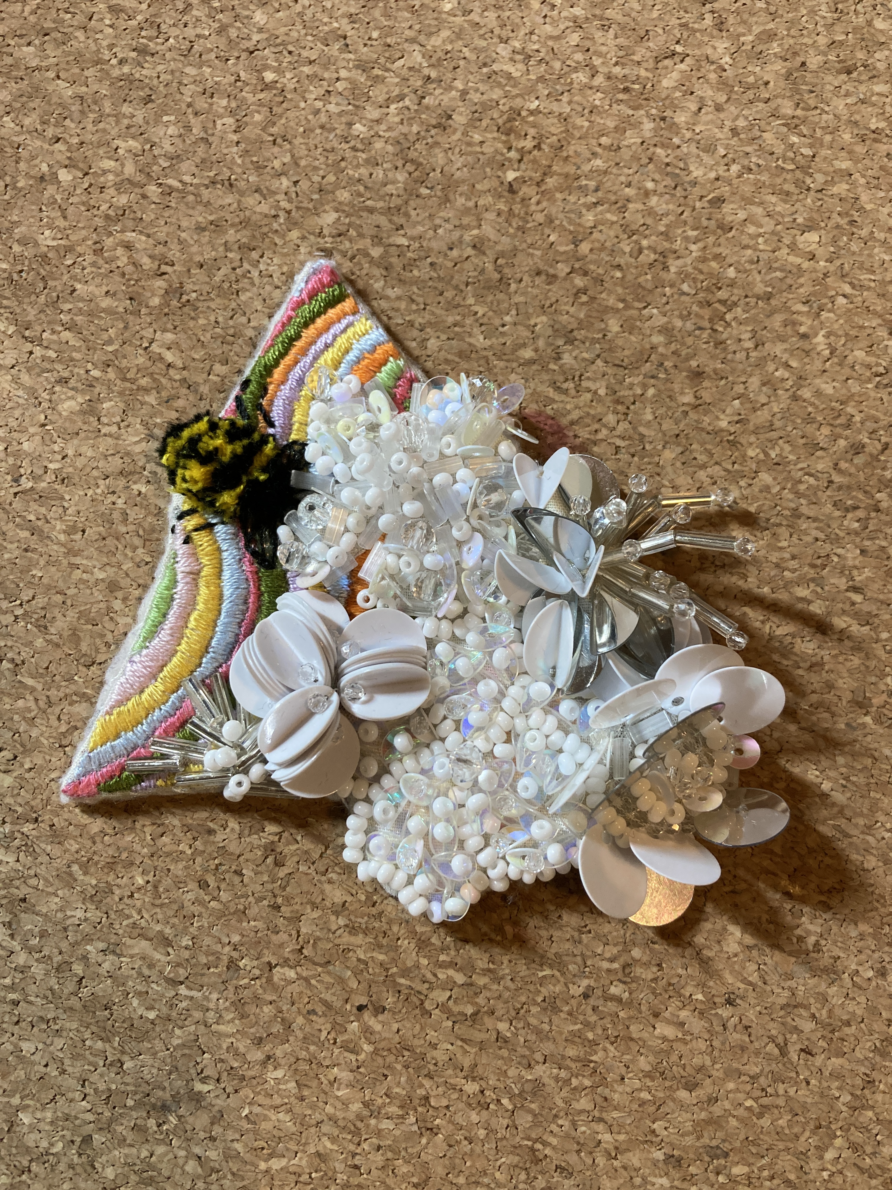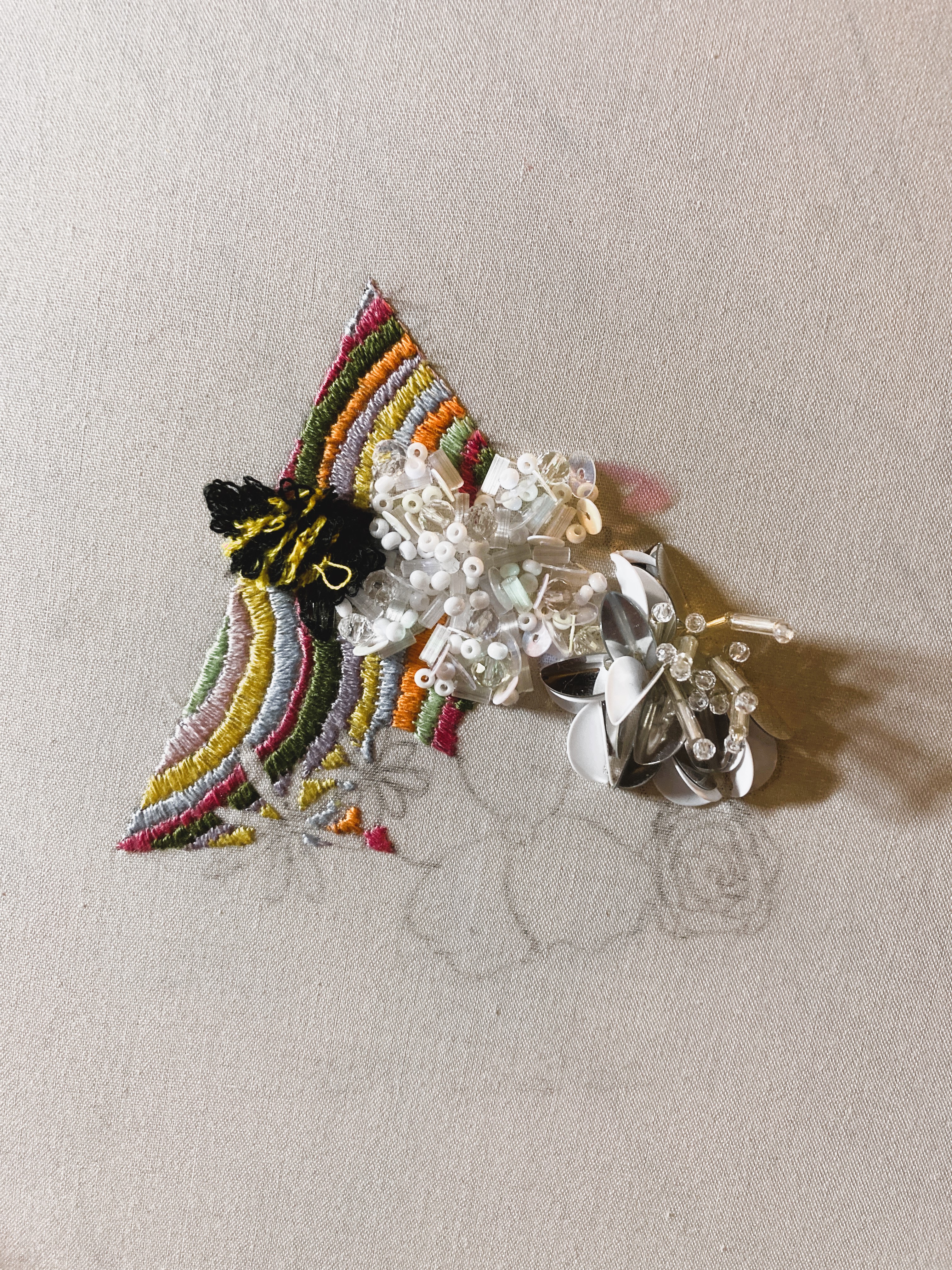 Get to know me through my work. The entire patch is meticulously embroidered on linen fabric and supported by a felt backing. Vibrant lines and the bee feature stitching with one-ply polyester/cotton blend thread. The three-dimensional flowers are crafted using white Japanese beads, clear glass beads, plastic tube beads, flat sequins, and paillette sequins, all secured with clear monofilament thread.