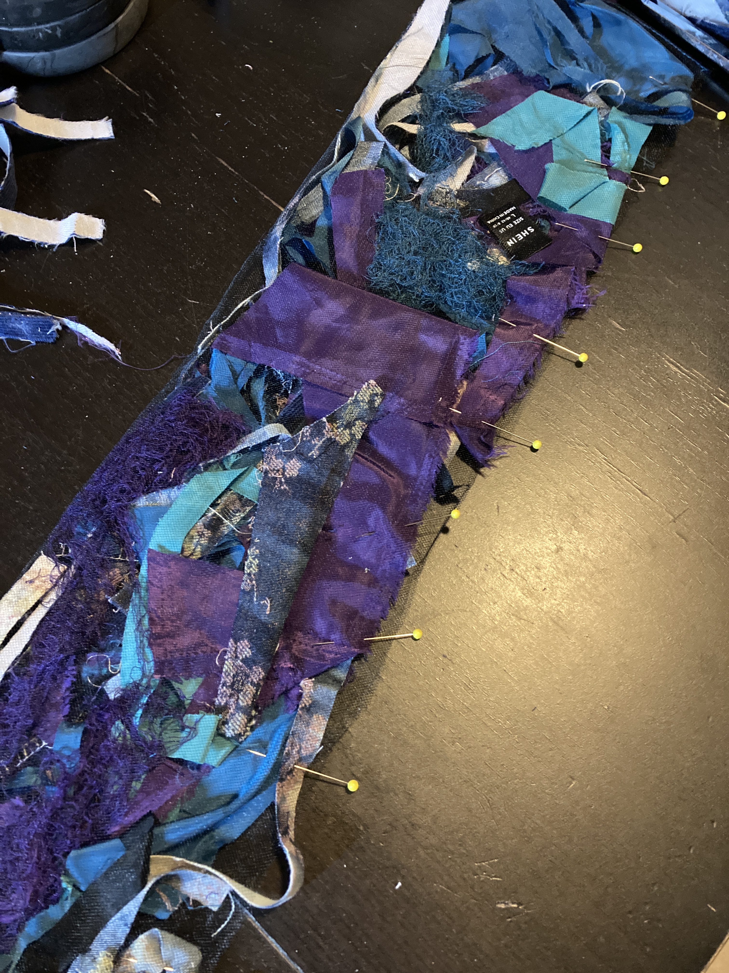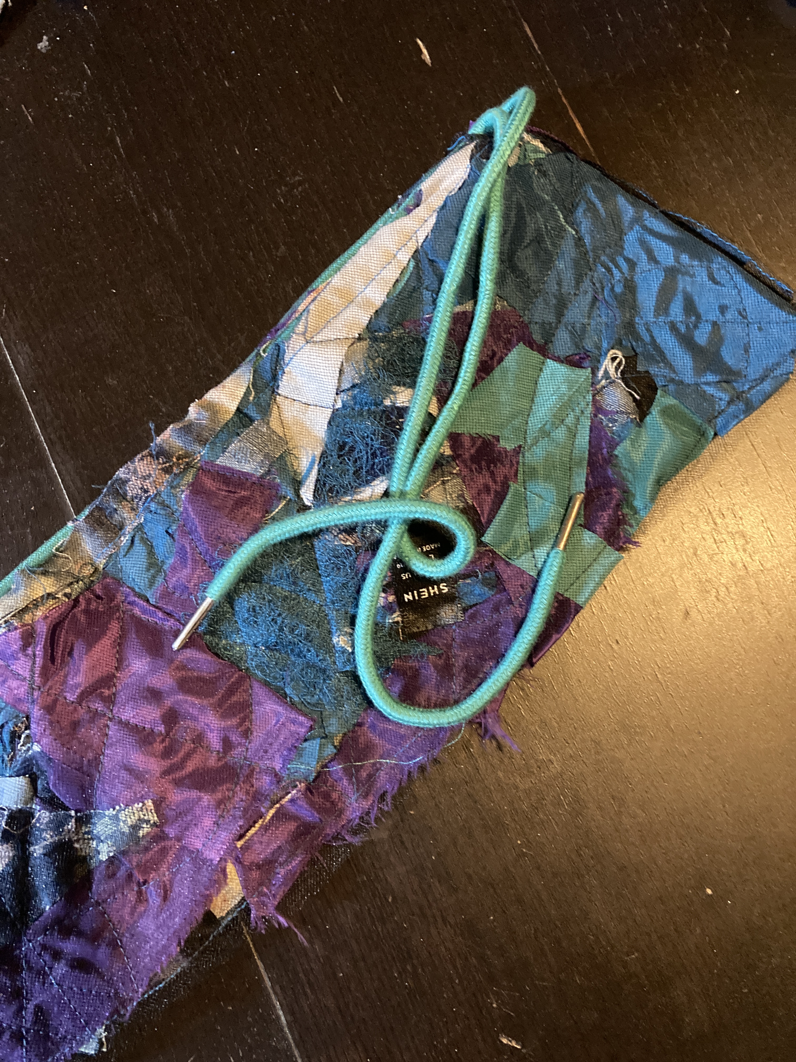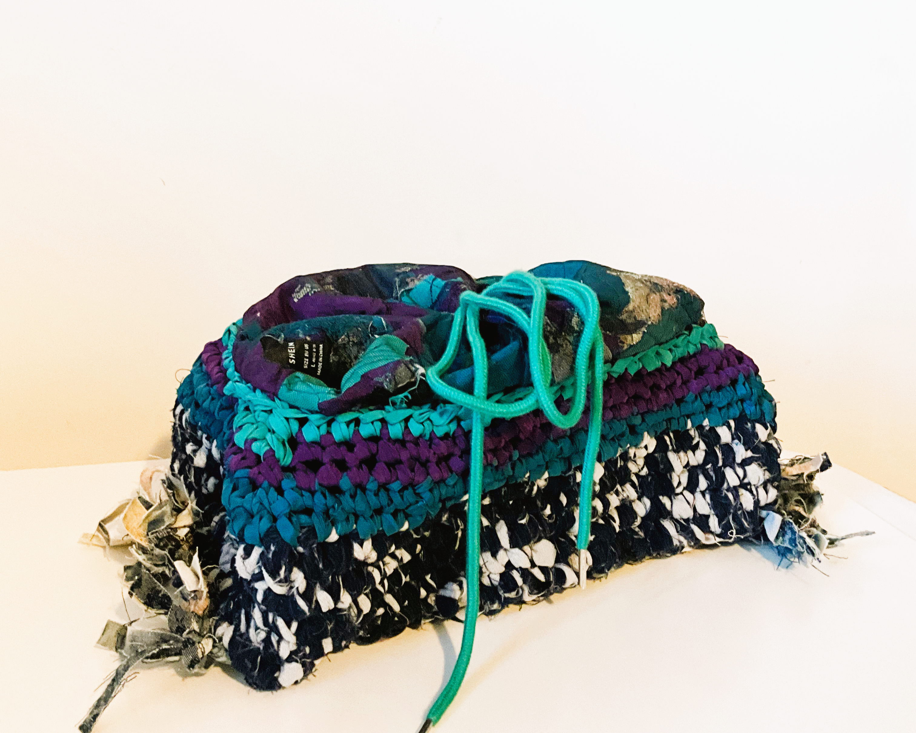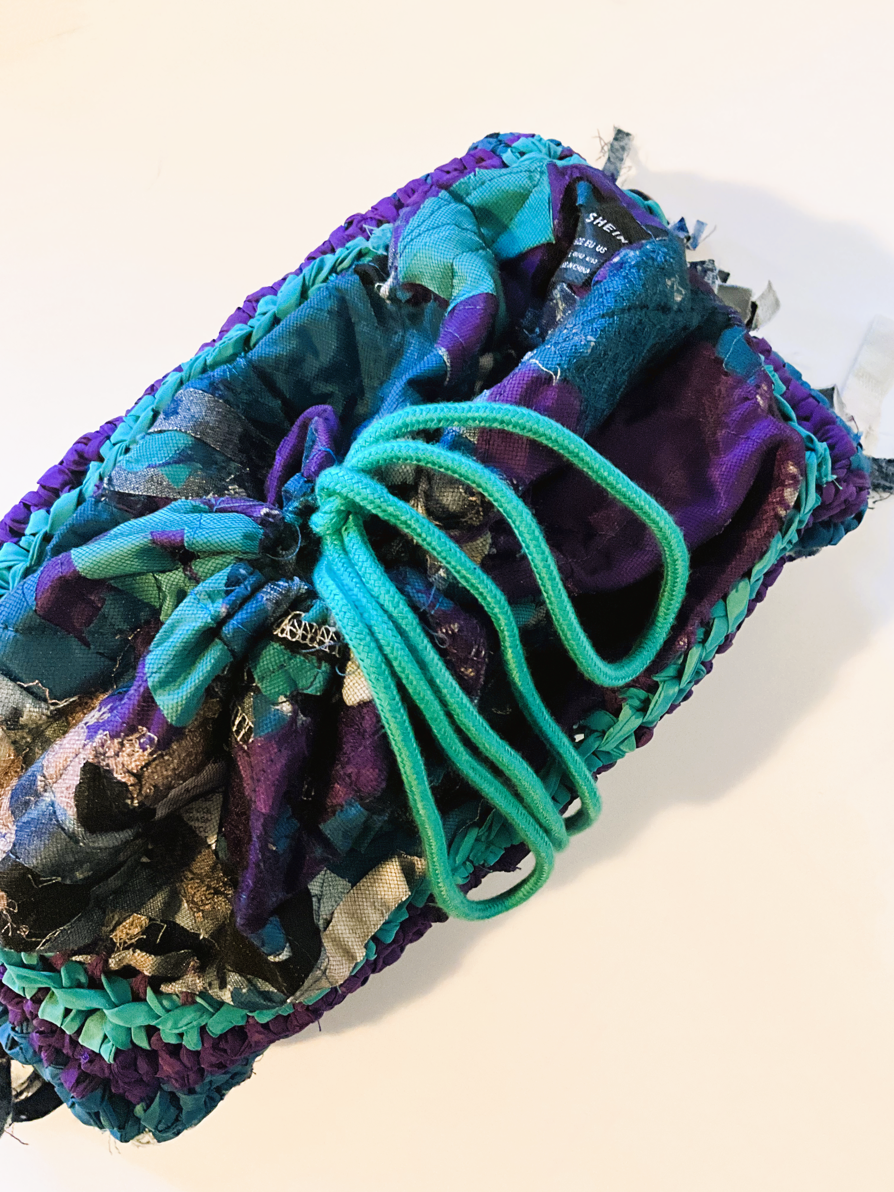 Starting with the bag’s base, I braided some denim strips, knotted them tightly at both ends to avoid sewing, and used them as warp. I then weaved corduroy strips as weft. I made the bag’s body using the crochet technique, starting with corduroy strips and finishing with the SHEIN tubes. As I crocheted using the SHEIN tubes, I decreased one stitch at the corners every round to create a slightly tapered lip. Next, I cut a rectangle of mesh scrap and sandwiched all the scraps, threads, and labels I collected from the process. I created an extension part with the machine embroidery/quilting technique. The cord draw collected from the SHEIN jacket was re-purposed as the bag’s closure. Finally, I attached the extension part to the body with the crochet technique.