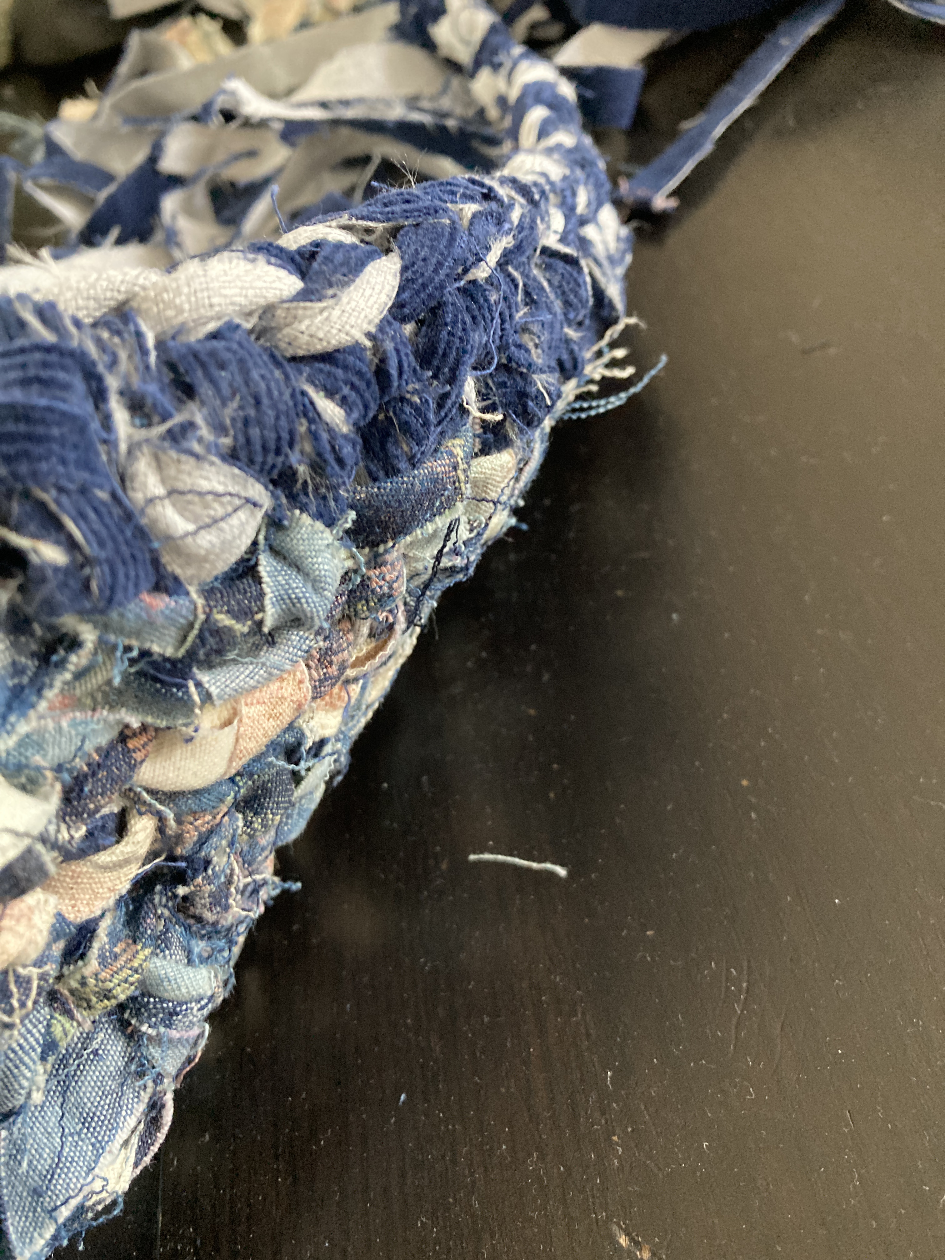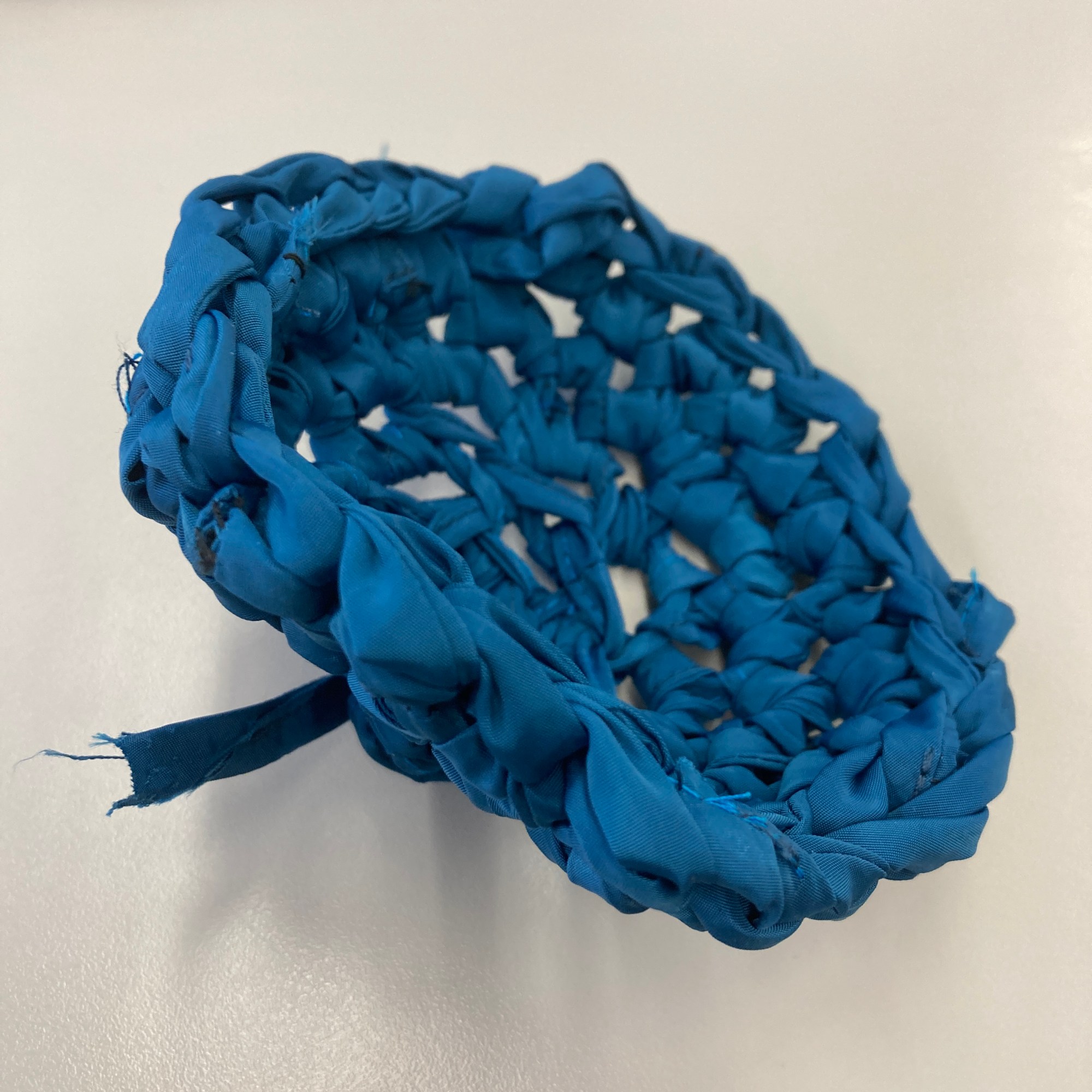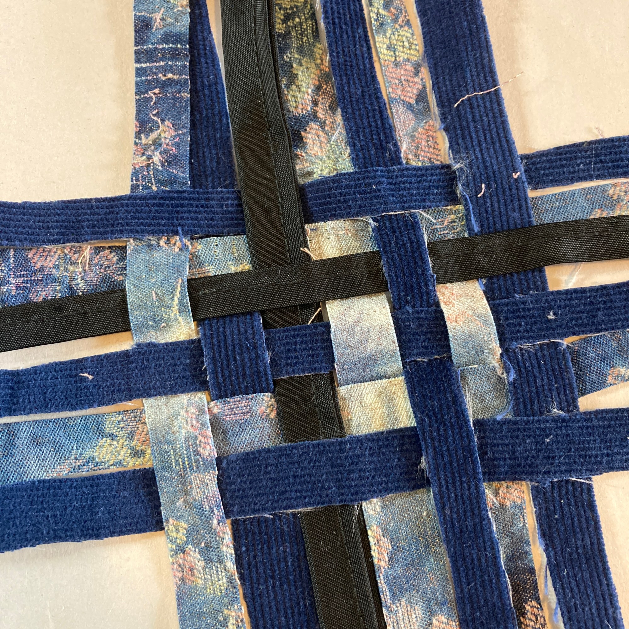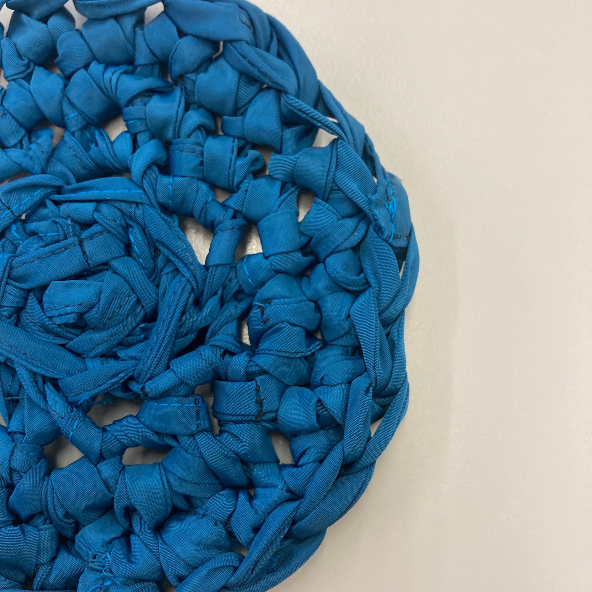 Starting with the bag’s base, I braided some denim strips, knotted them tightly at both ends to avoid sewing, and used them as warp. I then weaved corduroy strips as weft. I made the bag’s body using the crochet technique, starting with corduroy strips and finishing with the SHEIN tubes. As I crocheted using the SHEIN tubes, I decreased one stitch at the corners every round to create a slightly tapered lip. Next, I cut a rectangle of mesh scrap and sandwiched all the scraps, threads, and labels I collected from the process. I created an extension part with the machine embroidery/quilting technique. The cord draw collected from the SHEIN jacket was re-purposed as the bag’s closure. Finally, I attached the extension part to the body with the crochet technique.