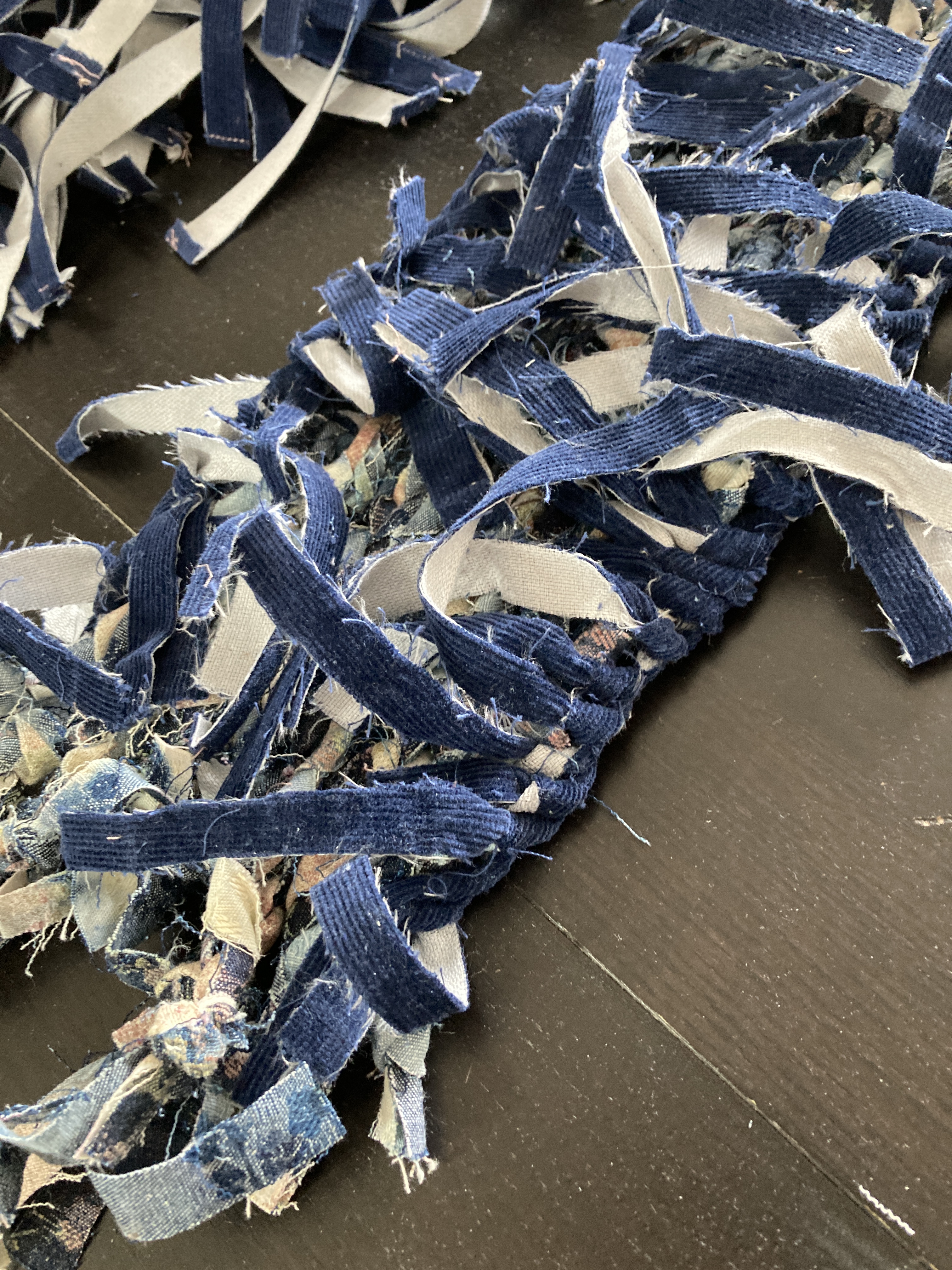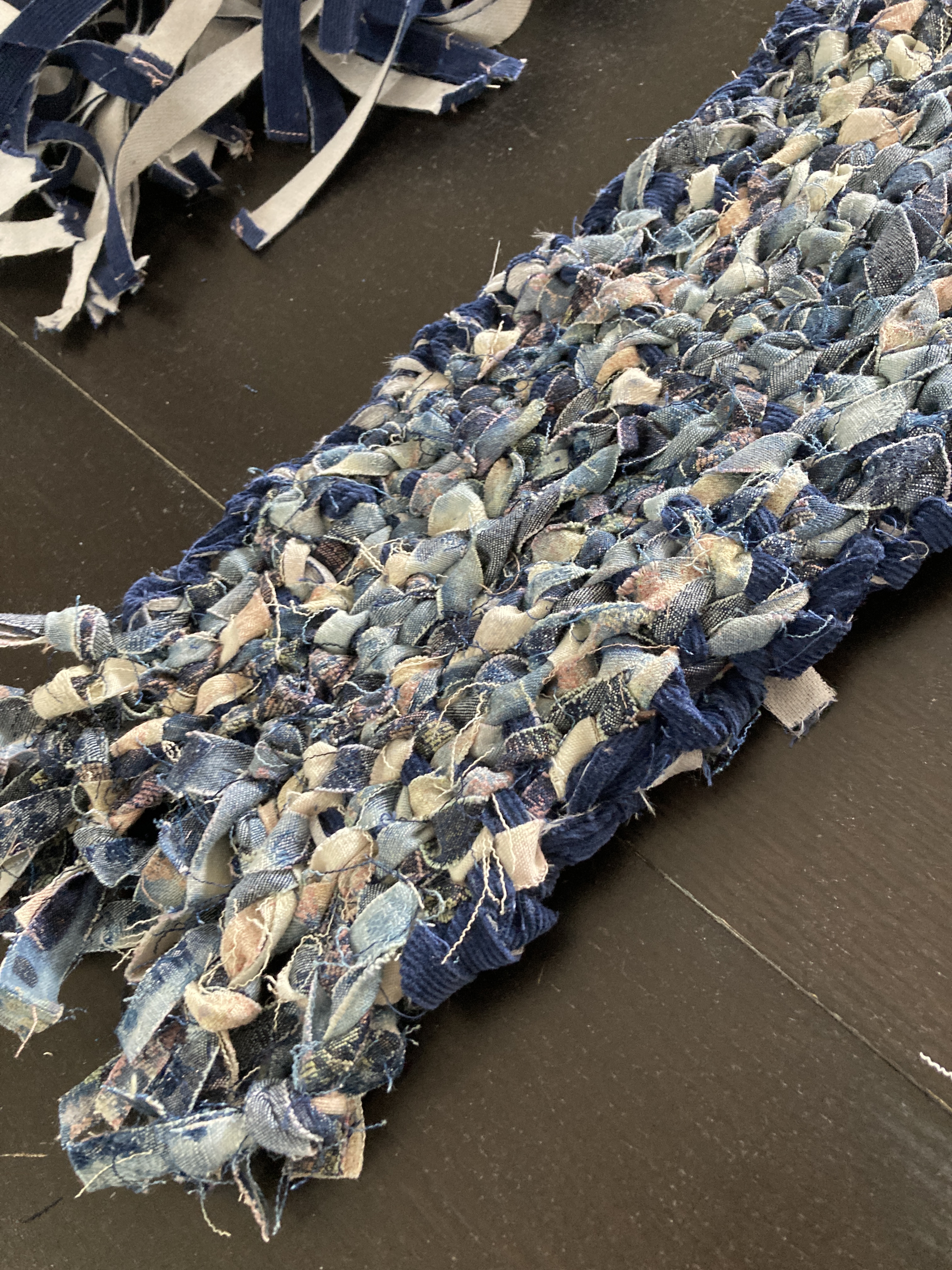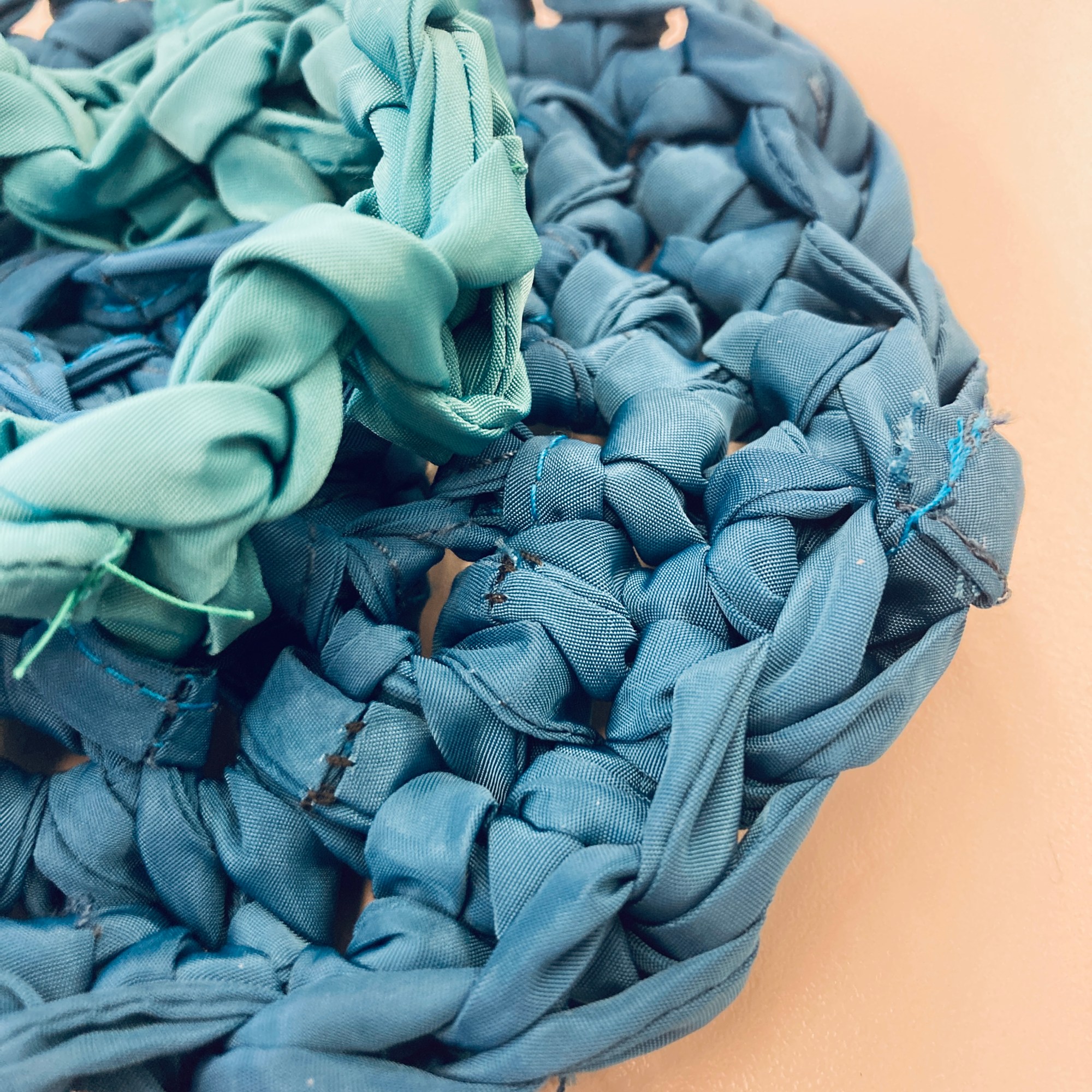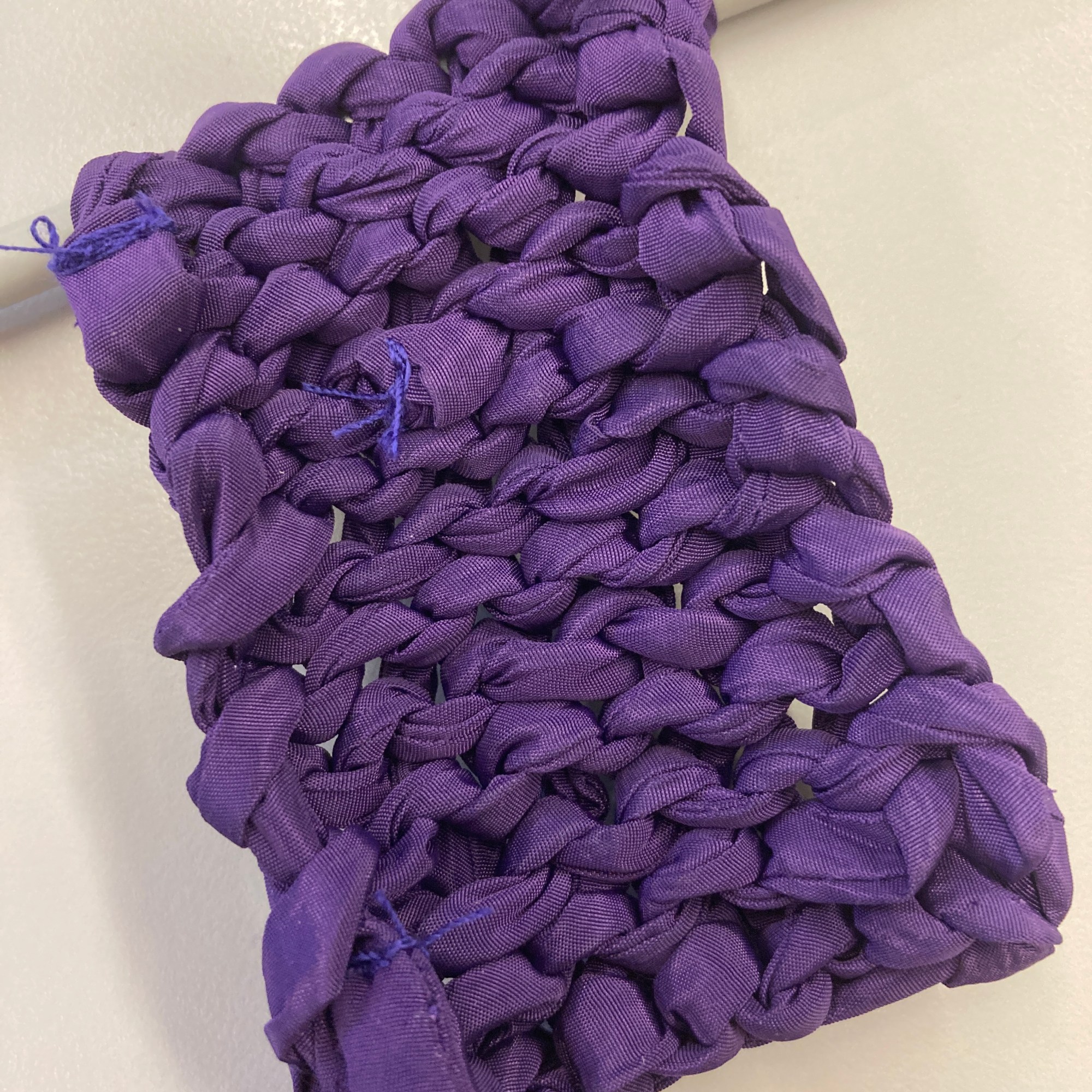 Starting with the bag’s base, I braided some denim strips, knotted them tightly at both ends to avoid sewing, and used them as warp. I then weaved corduroy strips as weft. I made the bag’s body using the crochet technique, starting with corduroy strips and finishing with the SHEIN tubes. As I crocheted using the SHEIN tubes, I decreased one stitch at the corners every round to create a slightly tapered lip. Next, I cut a rectangle of mesh scrap and sandwiched all the scraps, threads, and labels I collected from the process. I created an extension part with the machine embroidery/quilting technique. The cord draw collected from the SHEIN jacket was re-purposed as the bag’s closure. Finally, I attached the extension part to the body with the crochet technique.