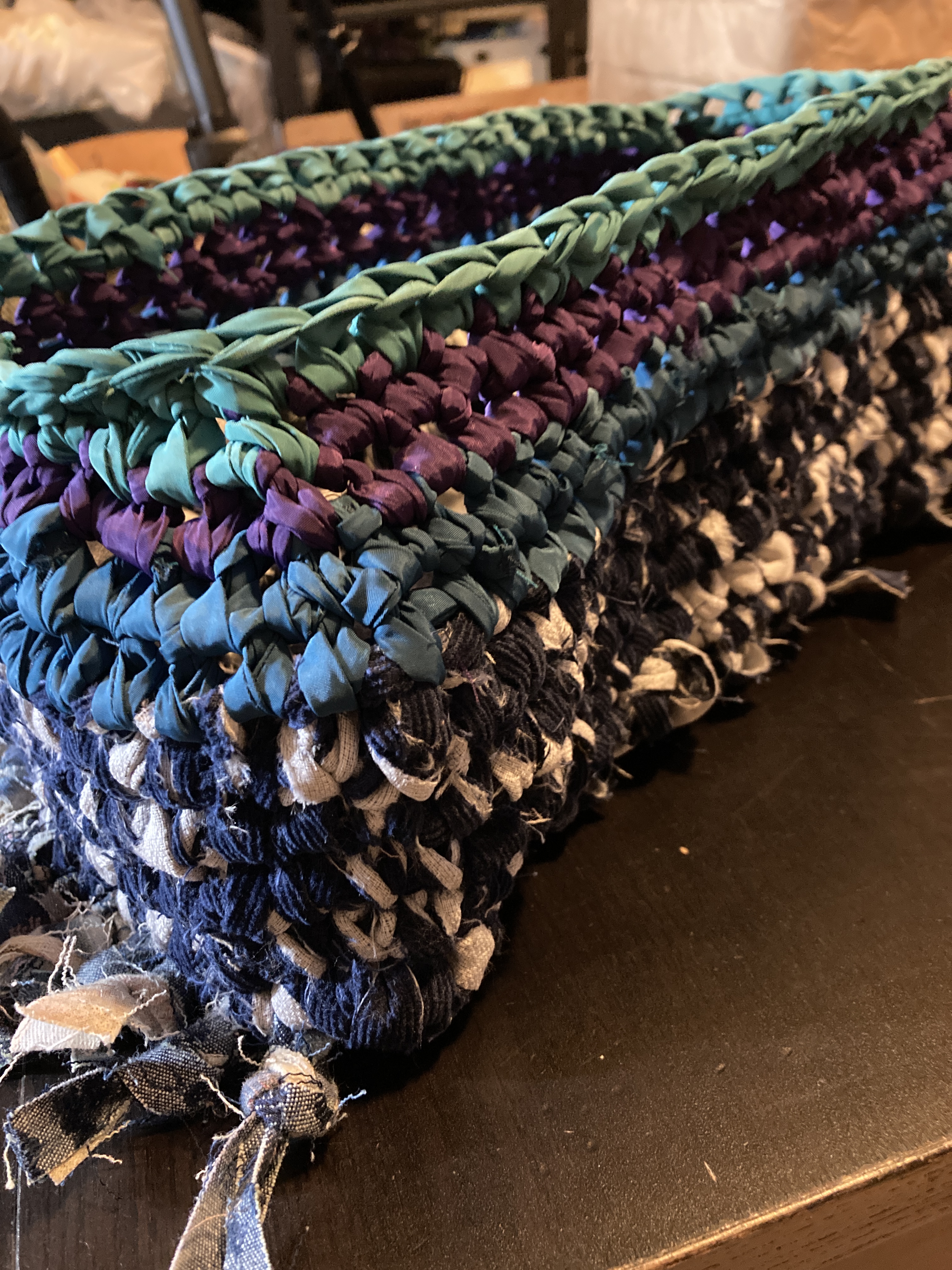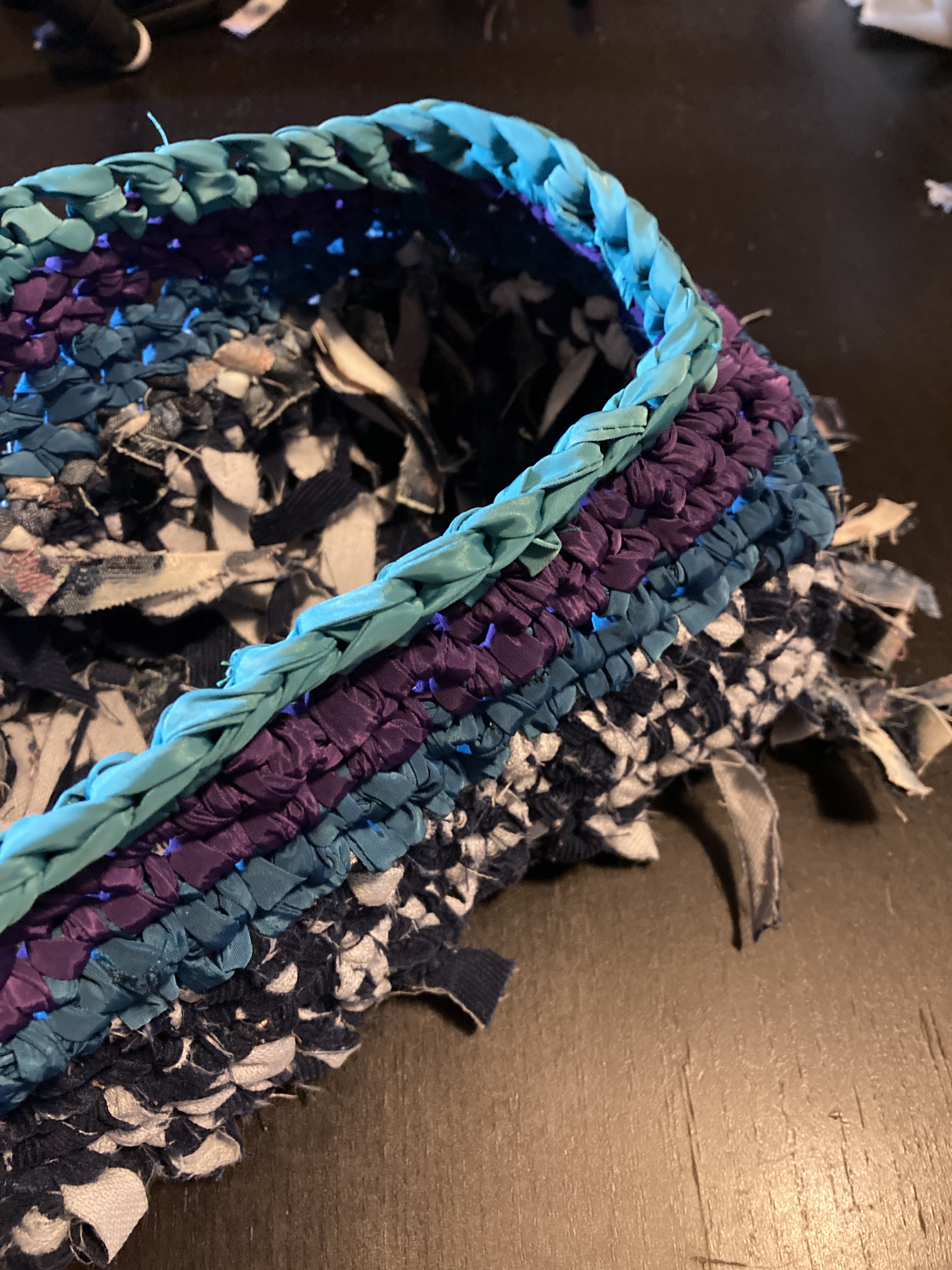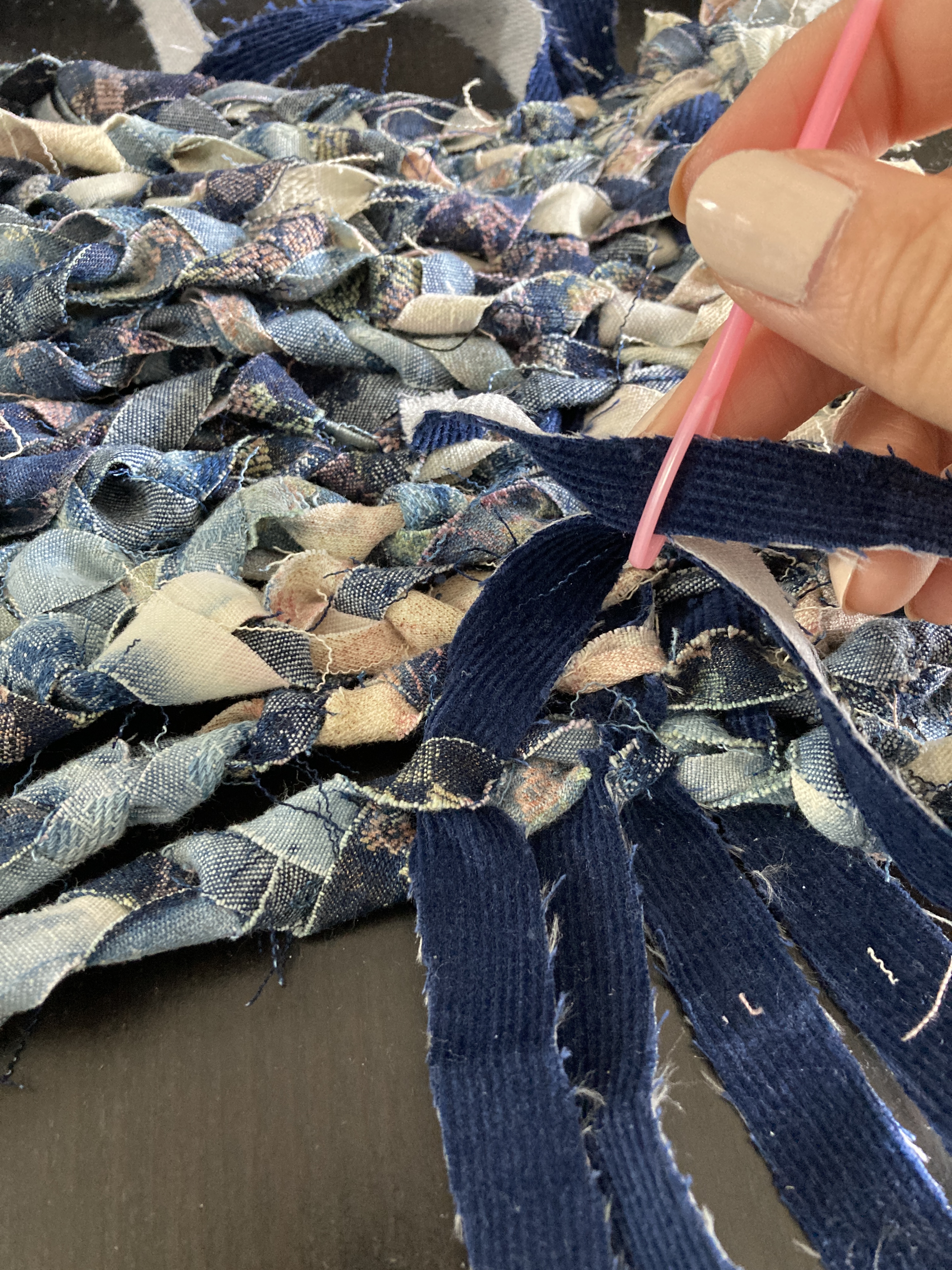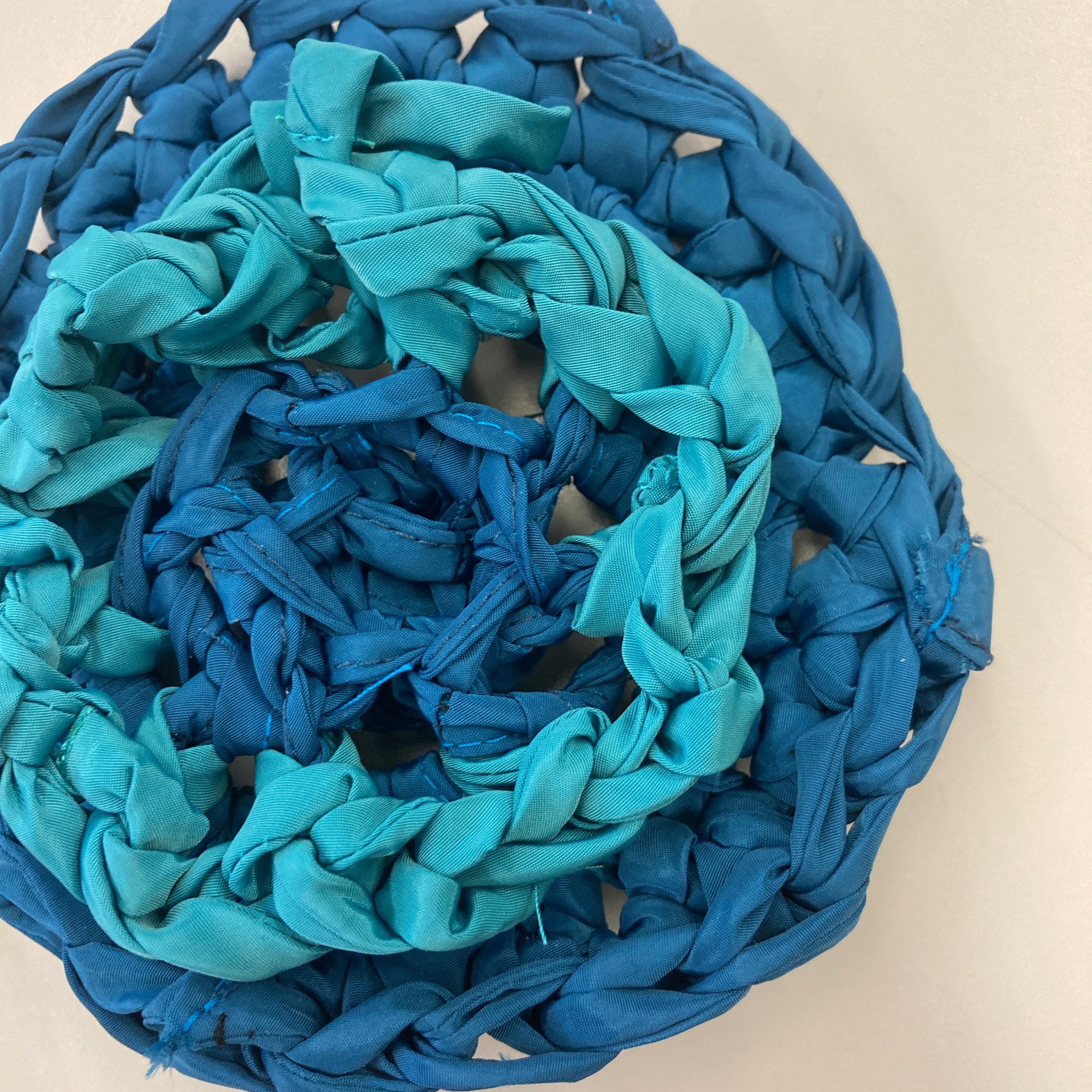 Starting with the bag’s base, I braided some denim strips, knotted them tightly at both ends to avoid sewing, and used them as warp. I then weaved corduroy strips as weft. I made the bag’s body using the crochet technique, starting with corduroy strips and finishing with the SHEIN tubes. As I crocheted using the SHEIN tubes, I decreased one stitch at the corners every round to create a slightly tapered lip. Next, I cut a rectangle of mesh scrap and sandwiched all the scraps, threads, and labels I collected from the process. I created an extension part with the machine embroidery/quilting technique. The cord draw collected from the SHEIN jacket was re-purposed as the bag’s closure. Finally, I attached the extension part to the body with the crochet technique.