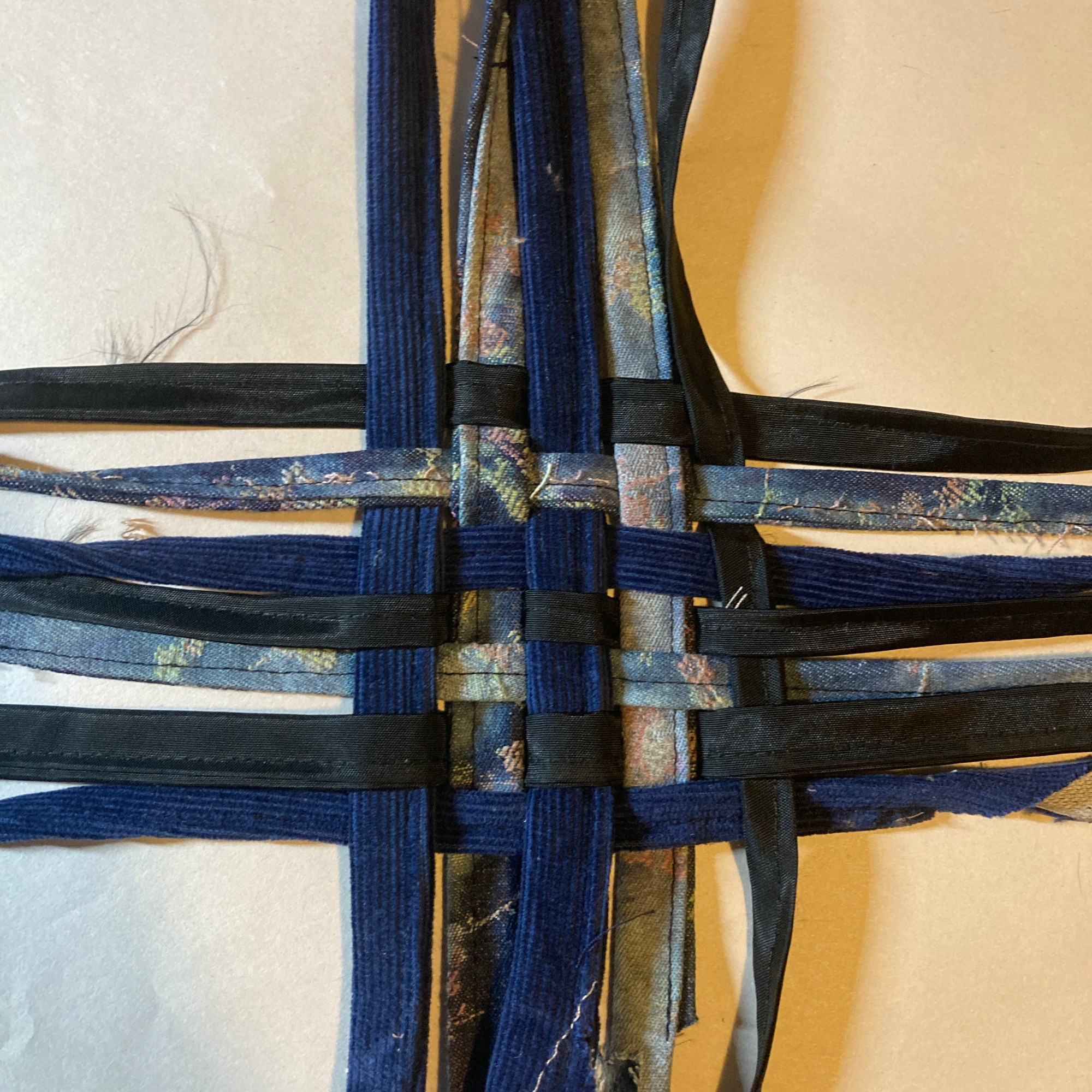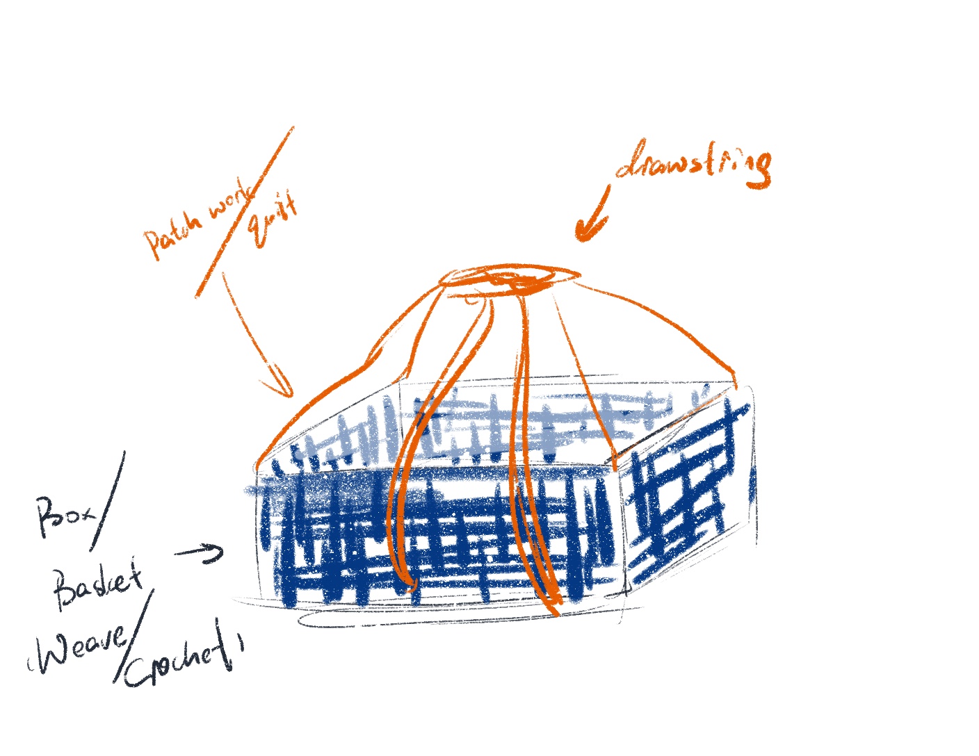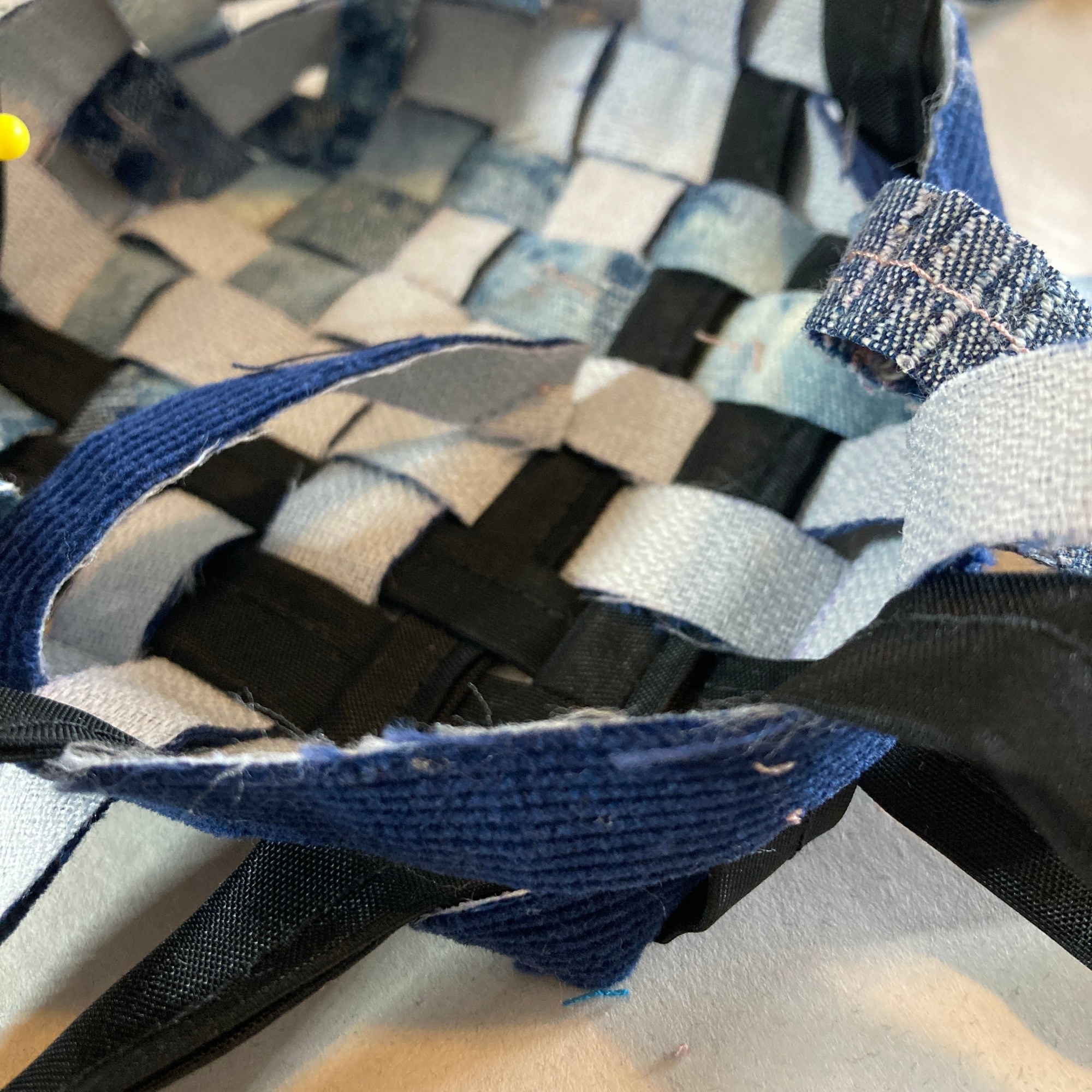A backpack was the original plan. However, the durability and tightness I want to achieve would use a large amount of material. Also, consider the weight of the bag based on the materials I used – denim and corduroy. I believe it is too heavy to carry over the shoulders. Because of all the above reasons, I changed the design to a clutch purse/basket, which can be used in two ways.