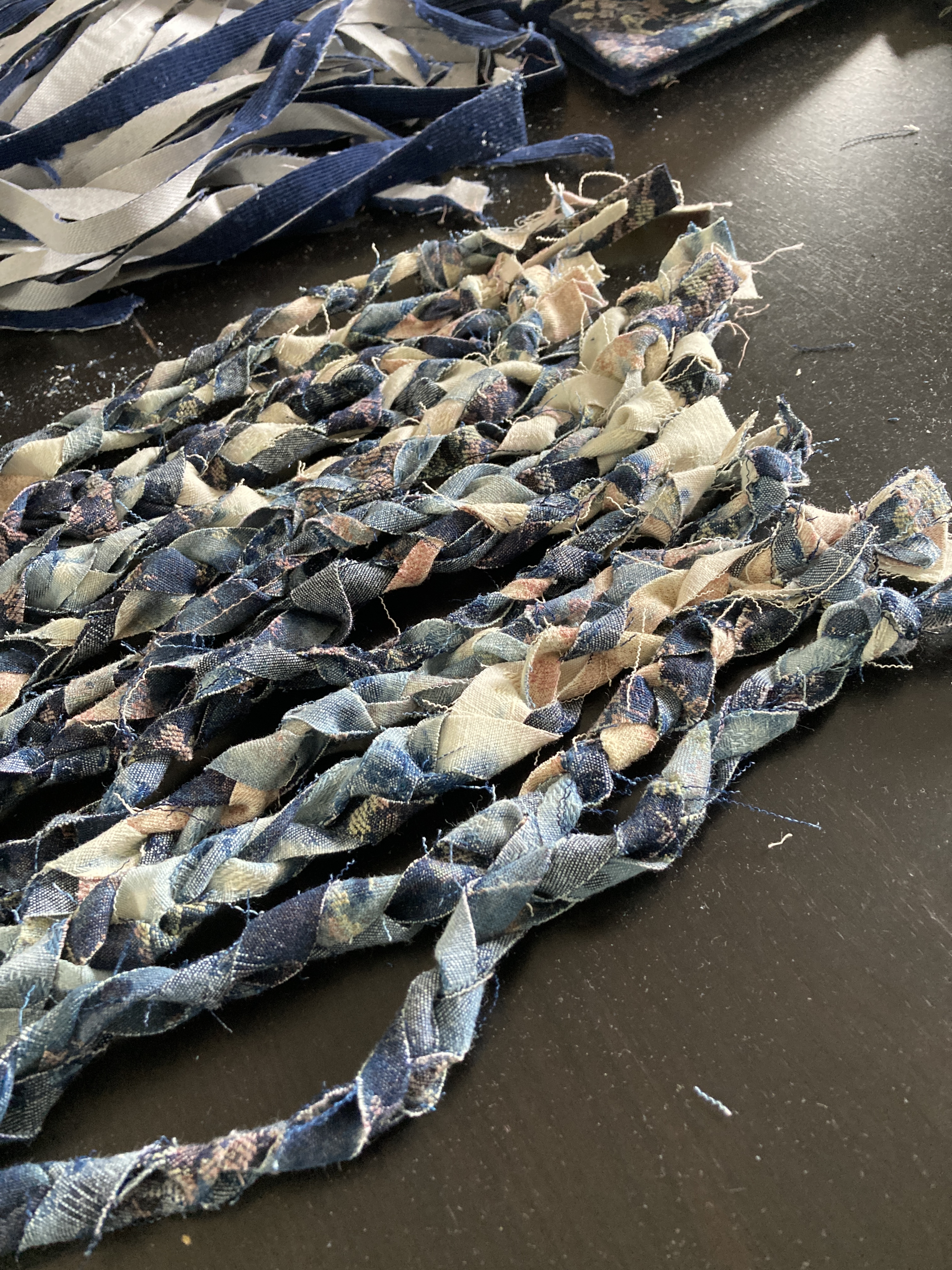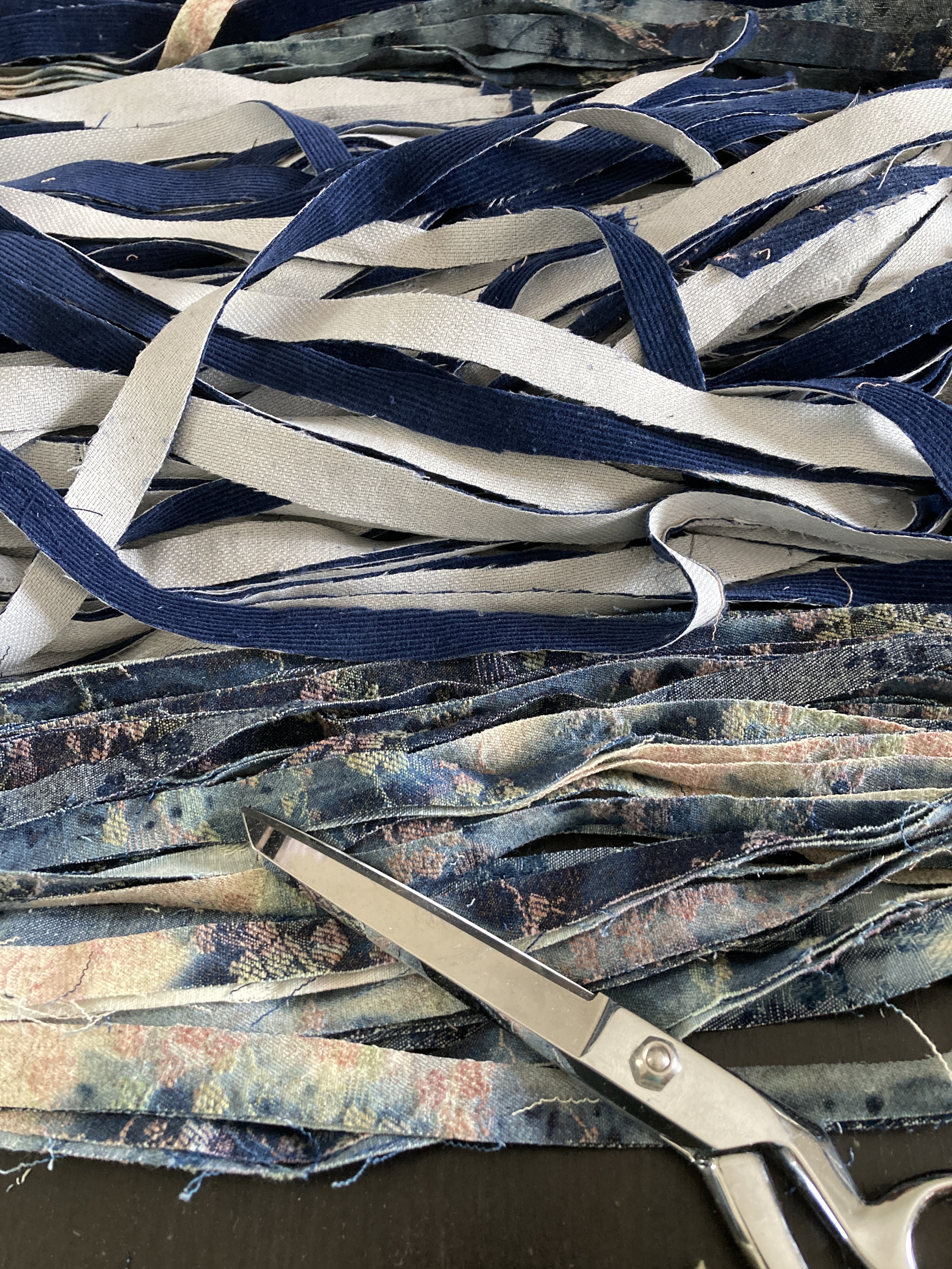 To minimize the waste and give me more room to create, I quilted the panels in the same colour, cut them into strips, and sewed them into continuous tubes.